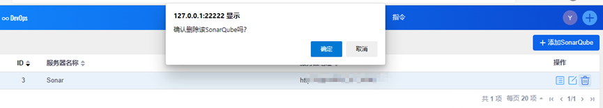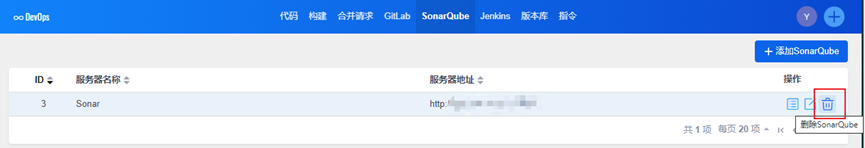 用户点击SonarQube服务器列表页中的删除SonarQube服务器按钮