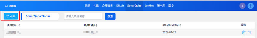 通过点击”SonarQube项目列表“进入SonarQube项目列表页面,页面包括左上角的”返回“按钮,