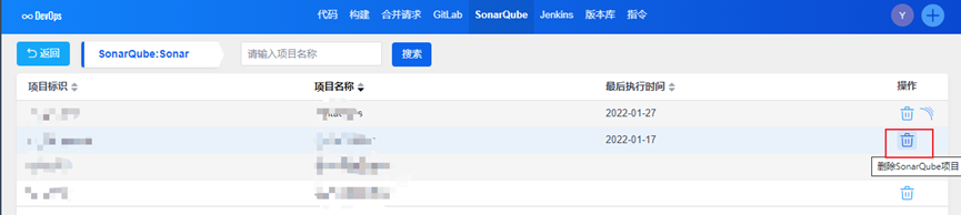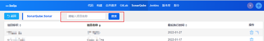 中部的搜索按钮,右上角的”添加SonarQube项目“按钮,页面中底部是SonarQube项目列表,列表包含项目标识、项目名称、最后执行时间和一列操作列,操作列中有删除按钮、执行SonarQube任务按钮。