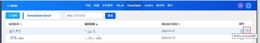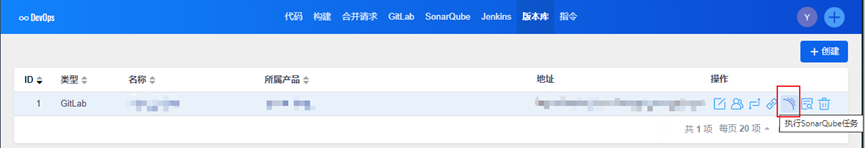 在“版本库”列表页面中,如果版本库与SonarQube构建任务关联,那么就在操作列中显示“执行SonarQube任务”按钮,当用户点击按钮后执行对应的SonarQube构建任务。