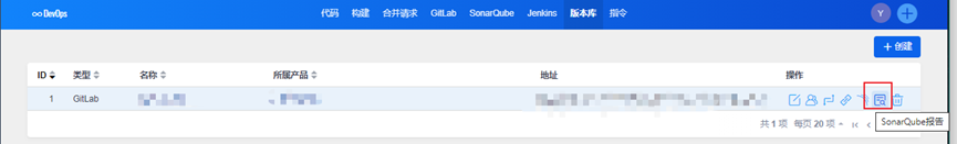 代码库列表页面中,当代码库关联一个SonarQube构建任务并且该构建任务已经执行成功生成SonarQube检查报告后,页面显示“SonarQube报告”按钮