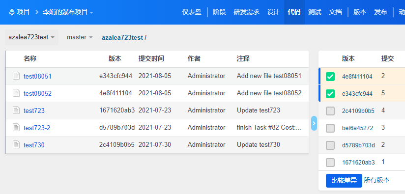 创建成功后,可以在项目--代码下查看到版本库信息。