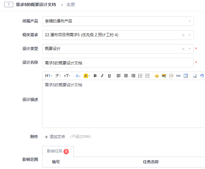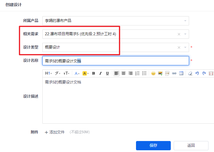 与项目关联的需求才会列在相关需求下拉列表中。可以在设计描述里填写概要设计文档的详细信息,也可以把写好的概要设计文档以附件上传。