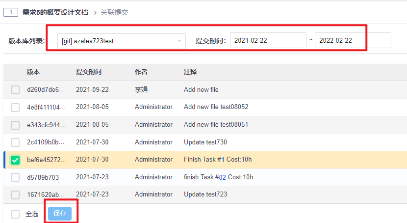 在设计关联提交页面,可以筛选版本库和提交时间,勾选提交,点击保存即可。