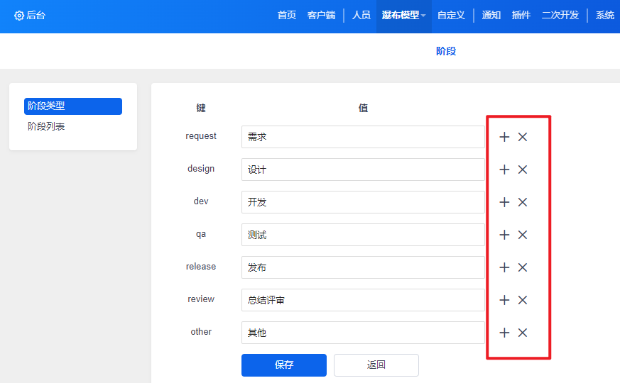 我们默认的阶段类型有需求、设计、开发、测试、发布、总结评审和其他。