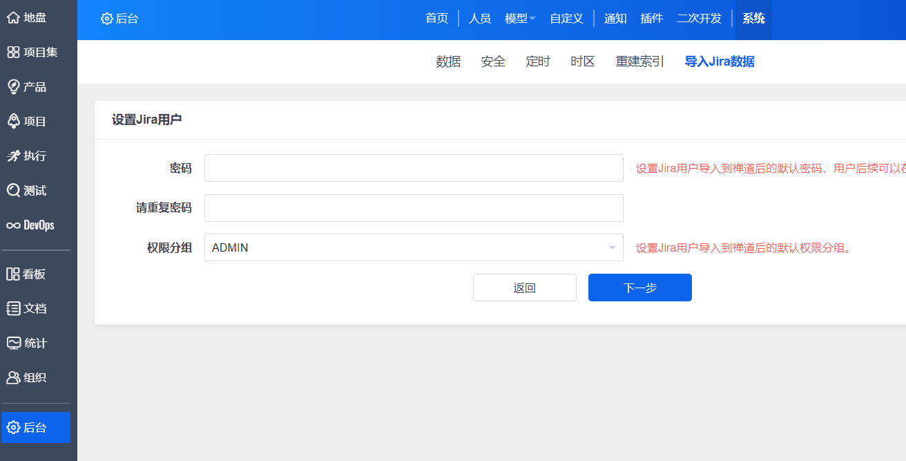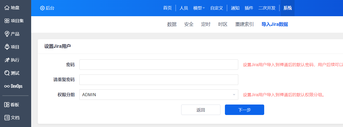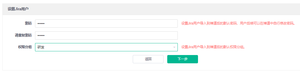因为禅道对用户密码的加密算法和Jira中的不一致,所以在导入Jira用户的时候,我们需要设置导入过来的用户的默认密码和权限分组,Jira的用户导入过来之后,密码统一为该页面设置的密码。