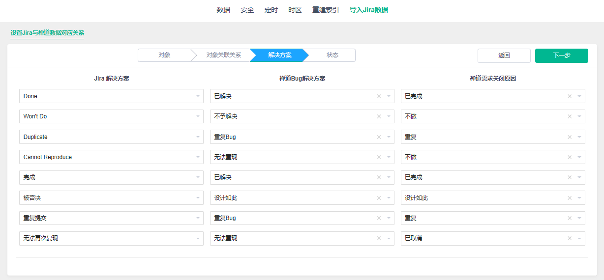 因为Jira的对象类型、关联关系、解决方案、对象状态等都是自定义的,所以把它导入到禅道里我们需要设置一个关系的映射,如果不选则该类型不会导入到禅道中。