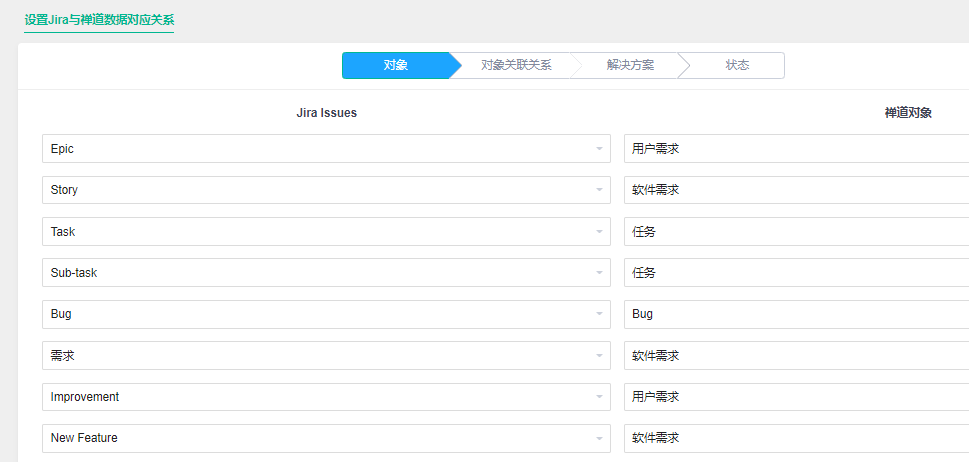5.按照提示设置Jira和禅道的对应关系:对象、对象关联关系、解决方案、状态、用户的密码和权限分组。