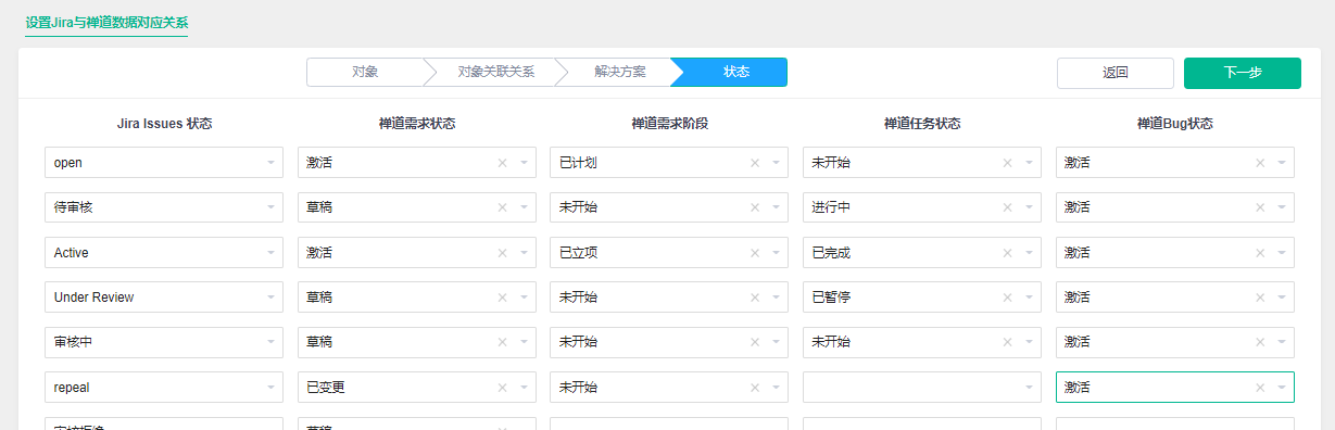 如果上述一切操作正常,点击下一步会来到设置Jira和禅道数据对应关系的页面。
