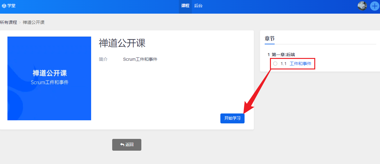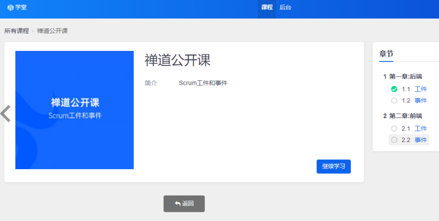 第一部分是面向员工的课程页面,通过课程可以查看到所有课程信息以及对应课程的详情,员工可以按照课程章节进行学习。