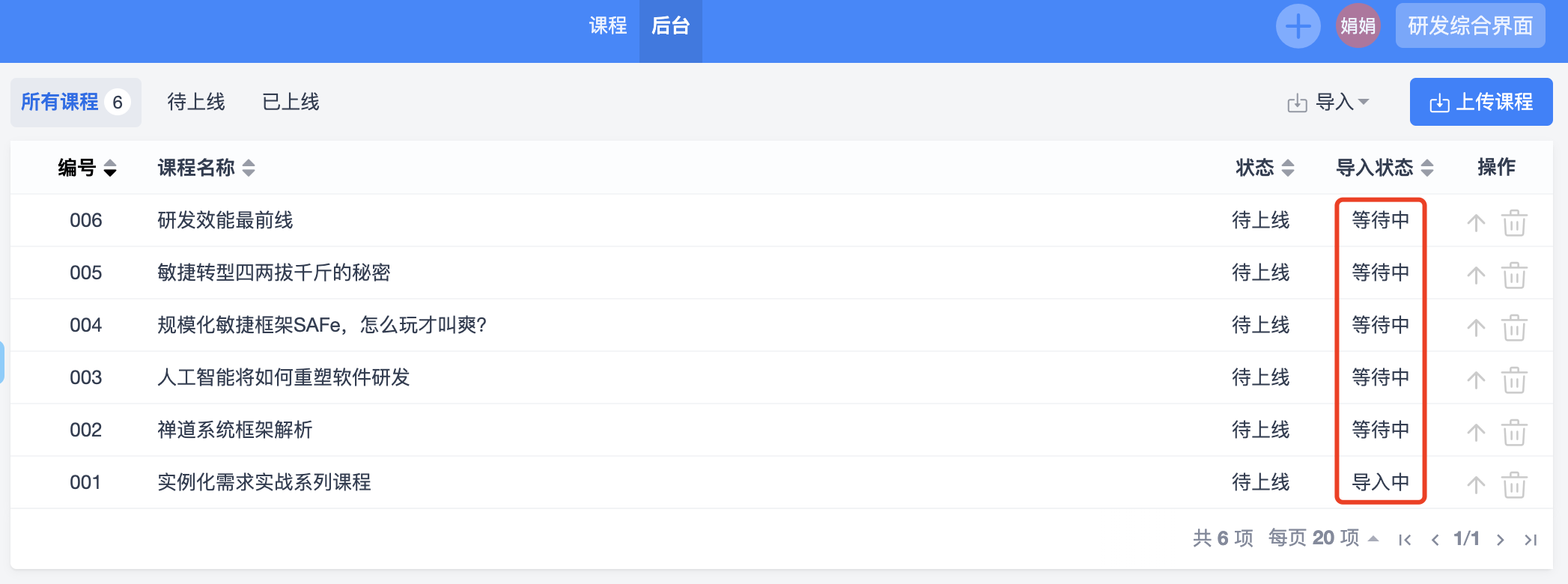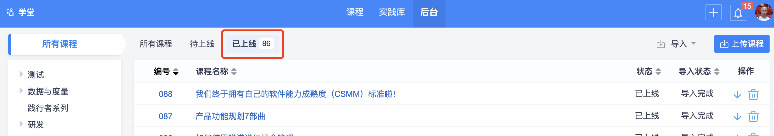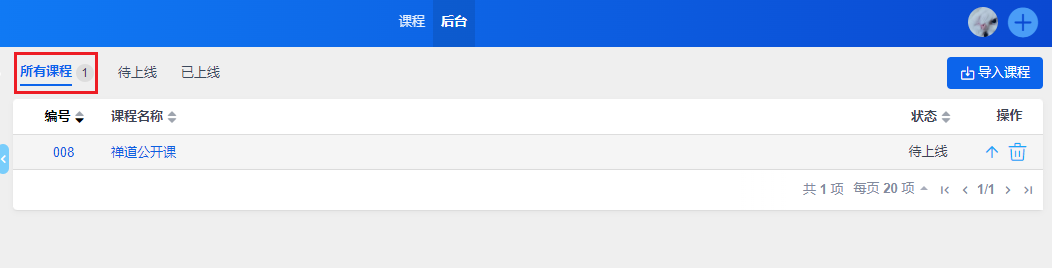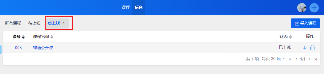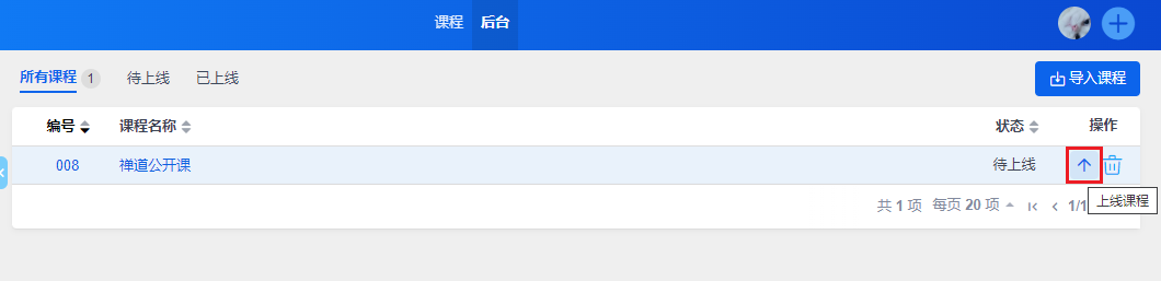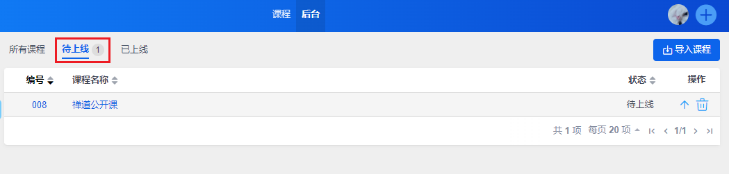 后台课程列表中可以查看到课程导入的状态,导入完成后课程会自动上线,课程前台就可以学习了。