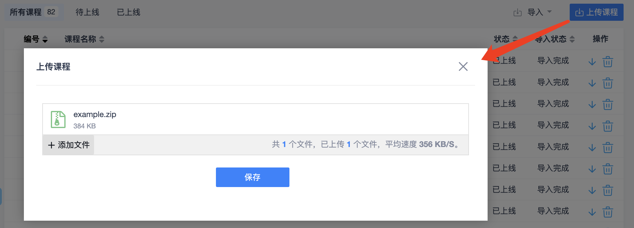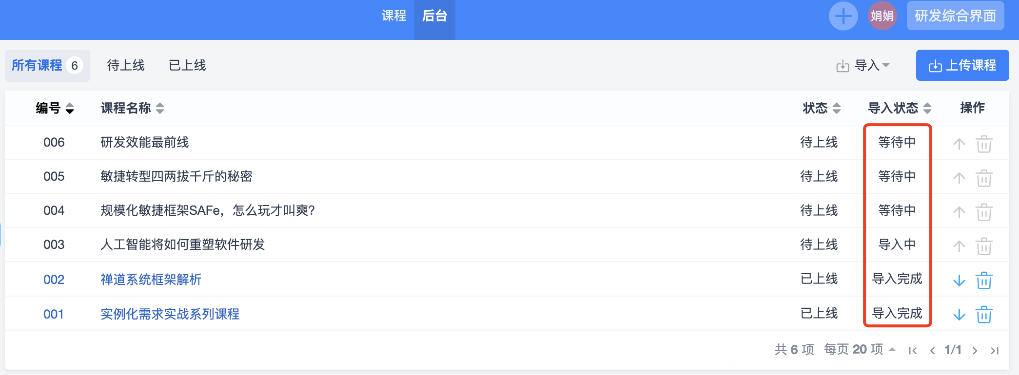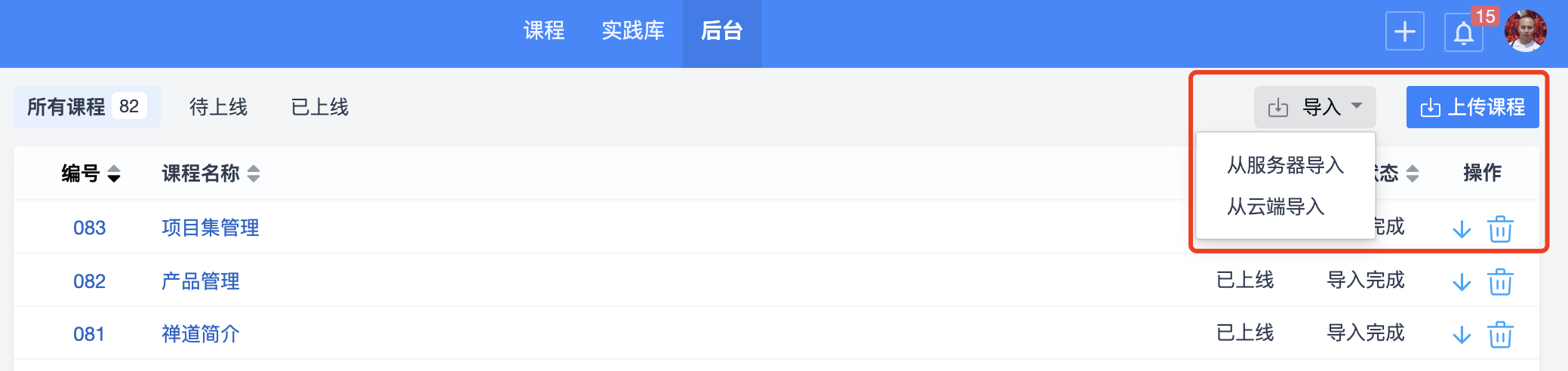 后台课程列表中可以查看到课程导入的状态,导入完成后课程会自动上线,课程前台就可以学习了。