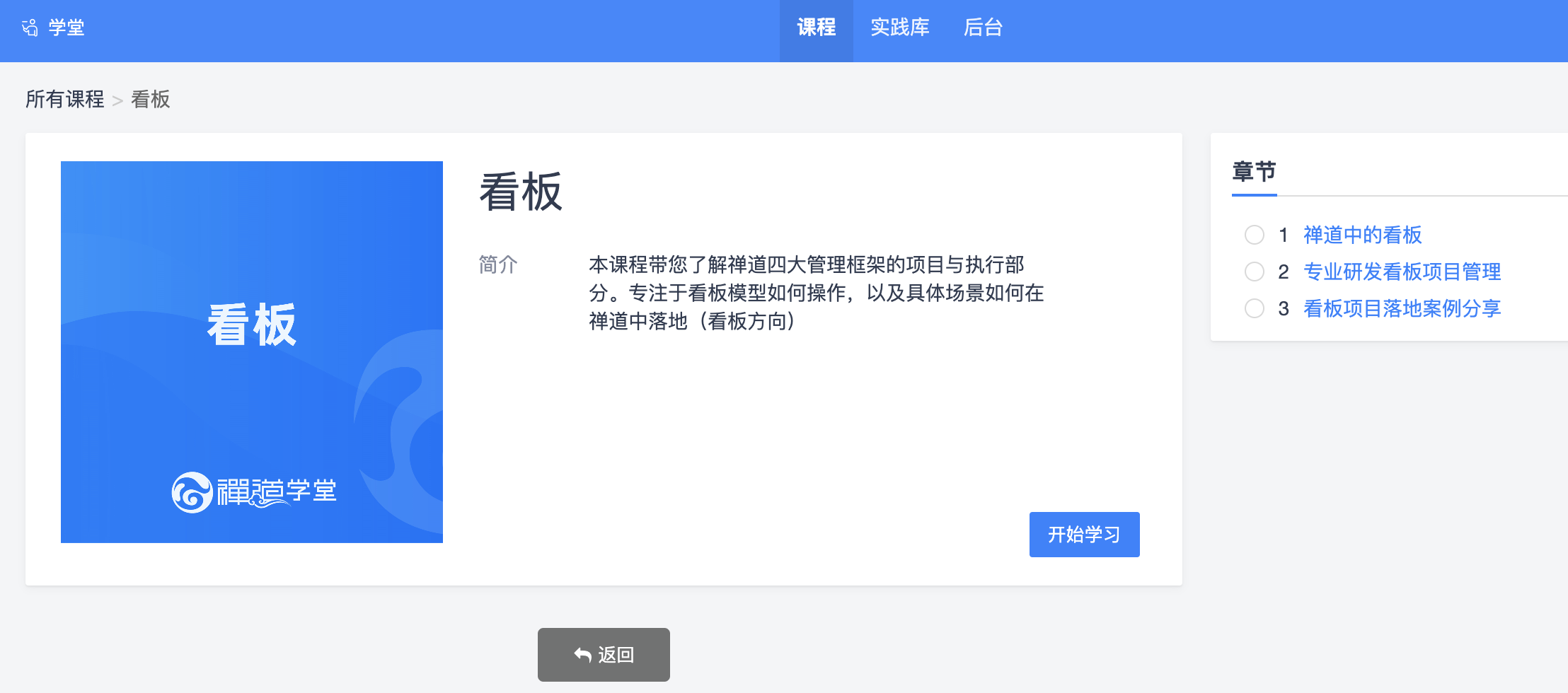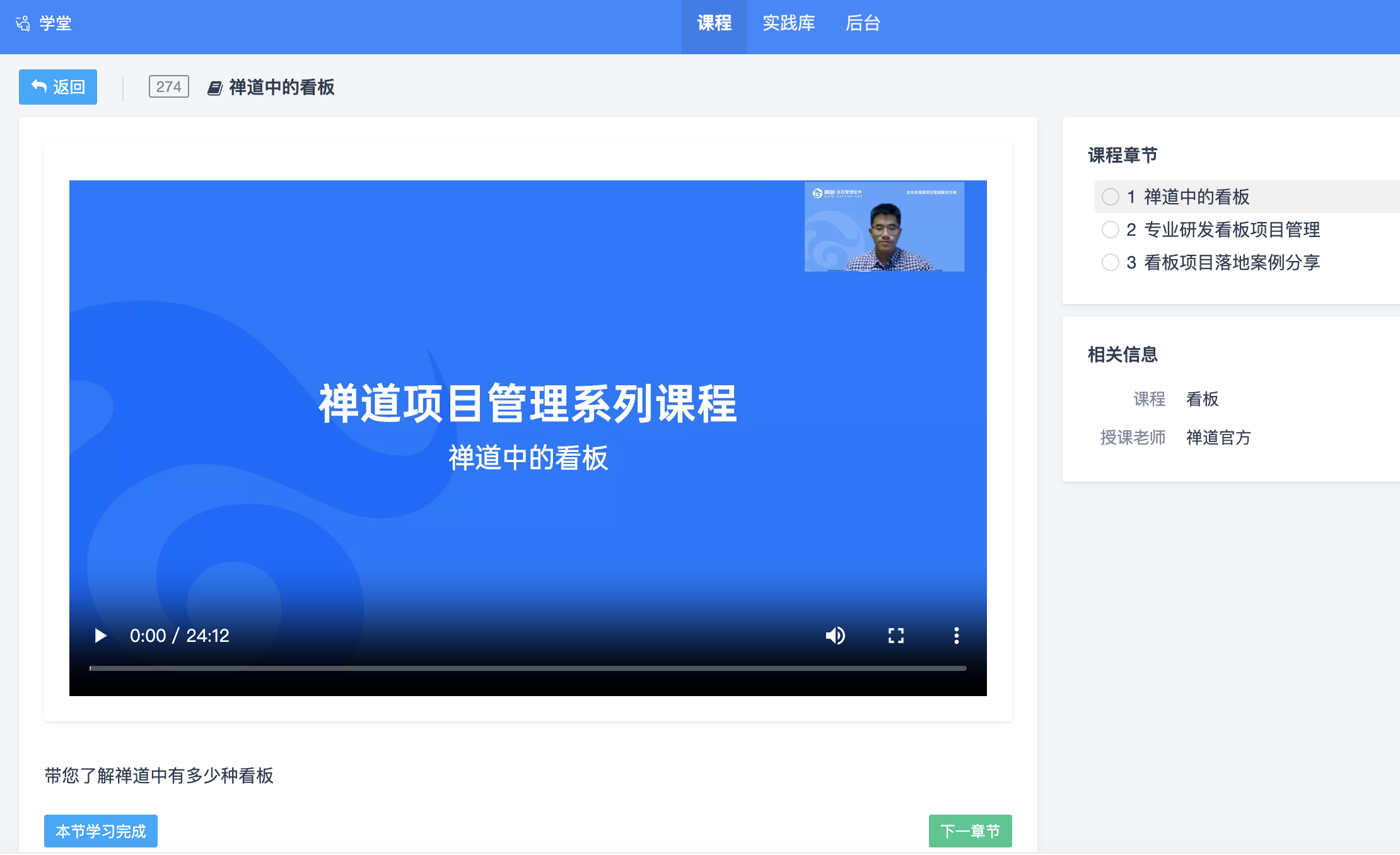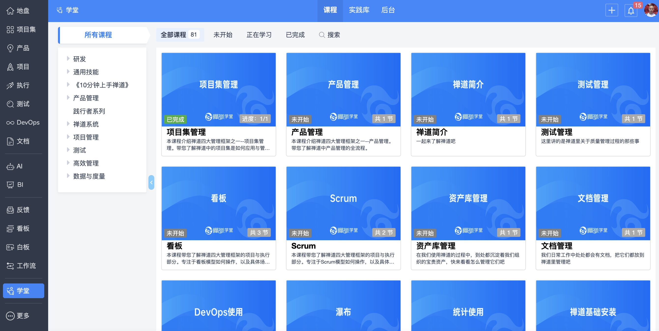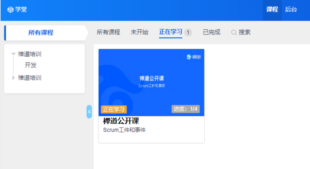 学堂功能主要为企业提供内部学习管理平台,学堂的课程内容主要聚焦于禅道软件的使用和项目管理的相关知识。