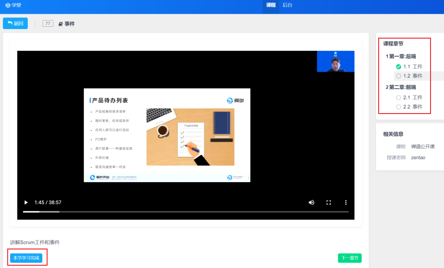 也可以点击具体章节进行切换和学习,学习完成后可以点击“本节学习完成”,这样一个章节就学习完成了。