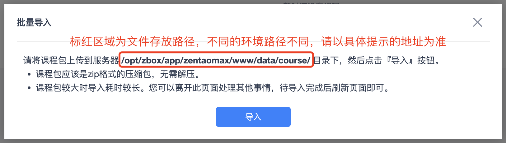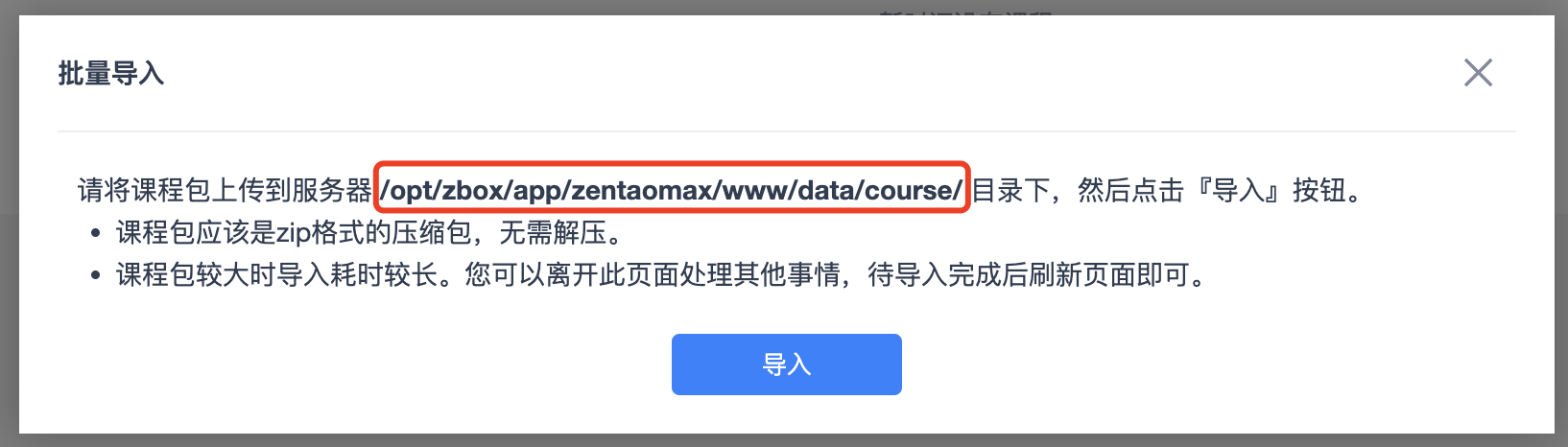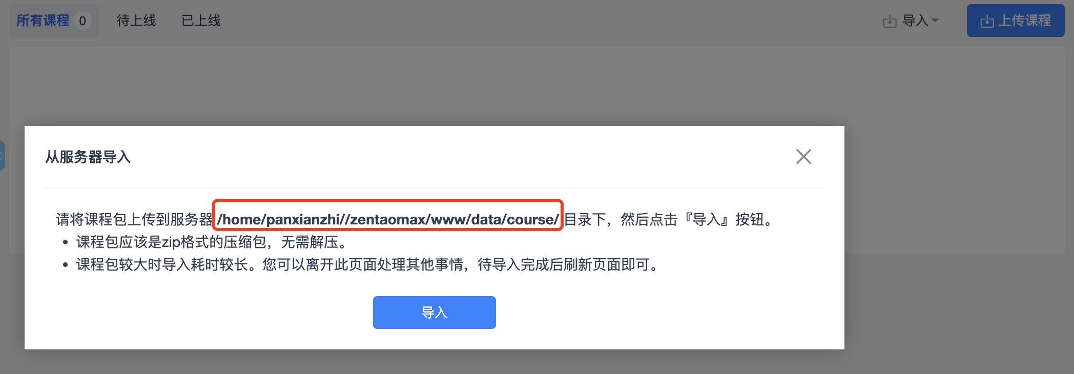 点击从服务器导入按钮,可以按照弹窗提示, 将课程包文件上传到服务器指定的目录下,然后点击『导入』按钮即可。