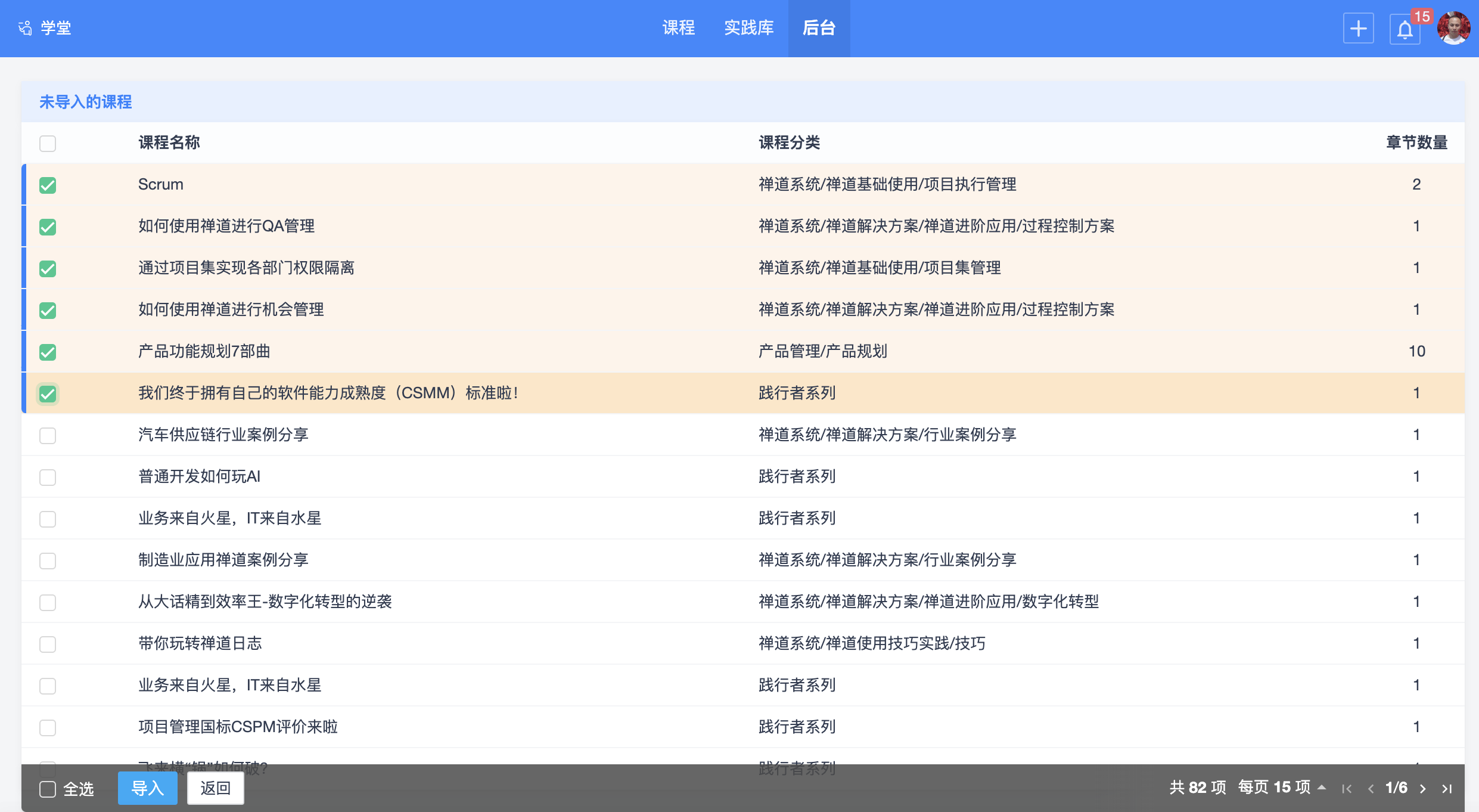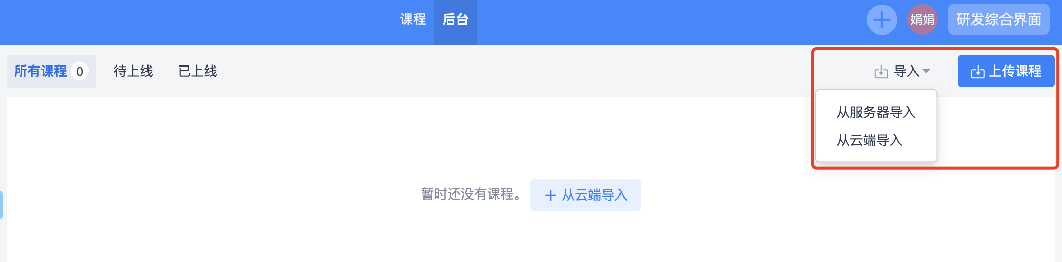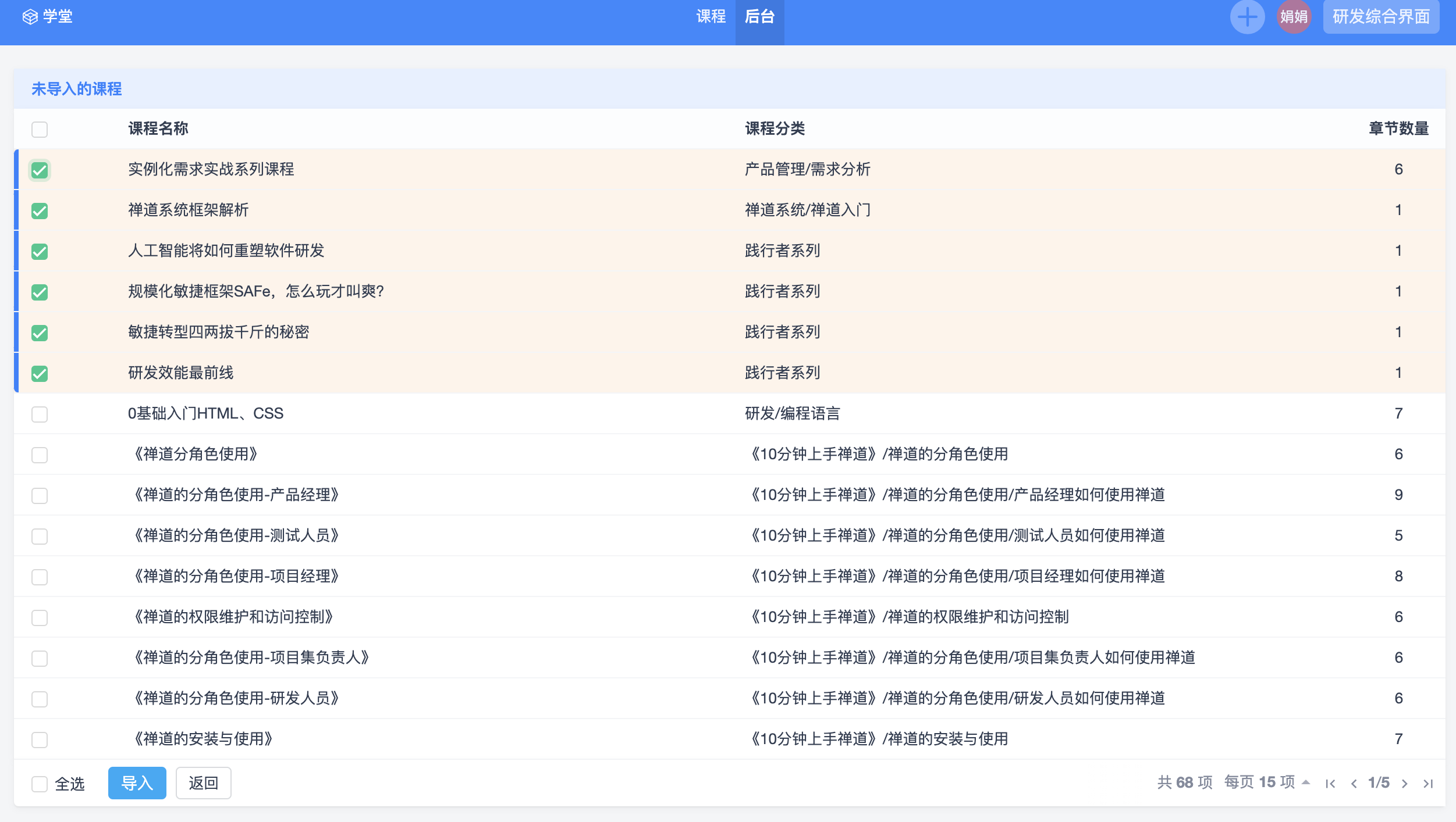 点击从云端导入,可以获取禅道在云端存储的课程列表,列表中可以选择一个或多个需要的课程,然后点击导入按钮,即可执行导入操作。