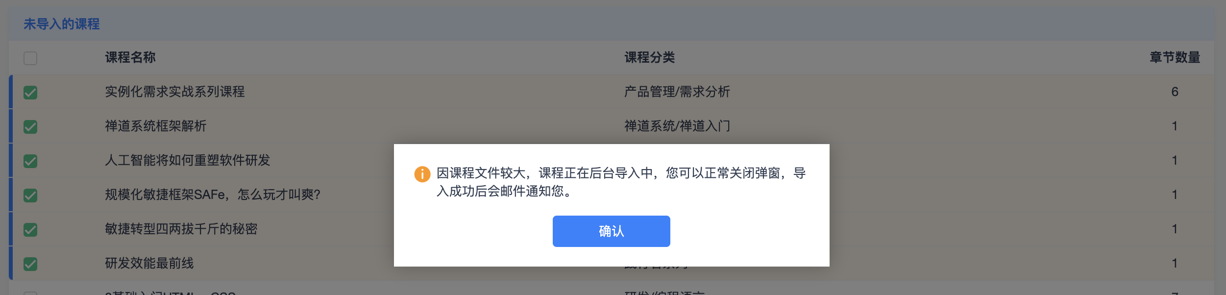 课程的文件都较大,导入课程是将云端的课程内容下载到用户本地学堂对应的课程目录中,所以导入过程中可以正常关闭弹窗,导入成功后会邮件通知。