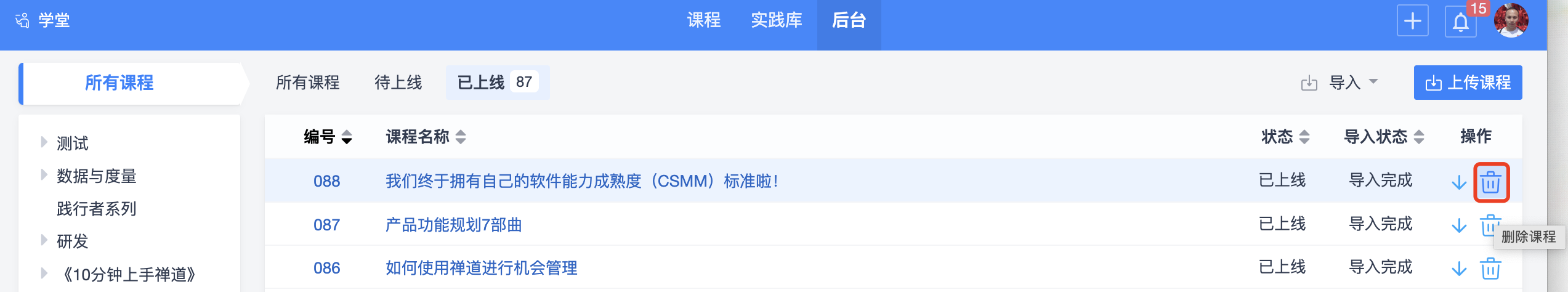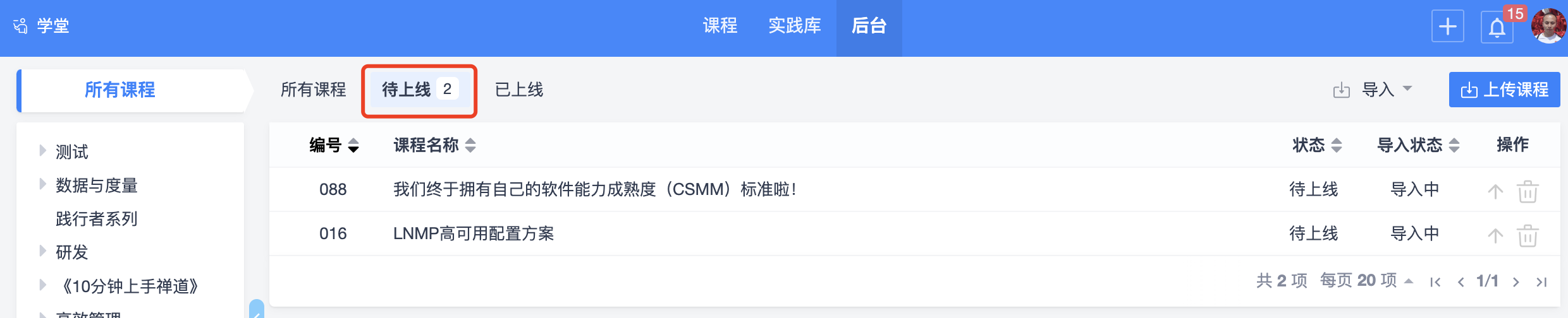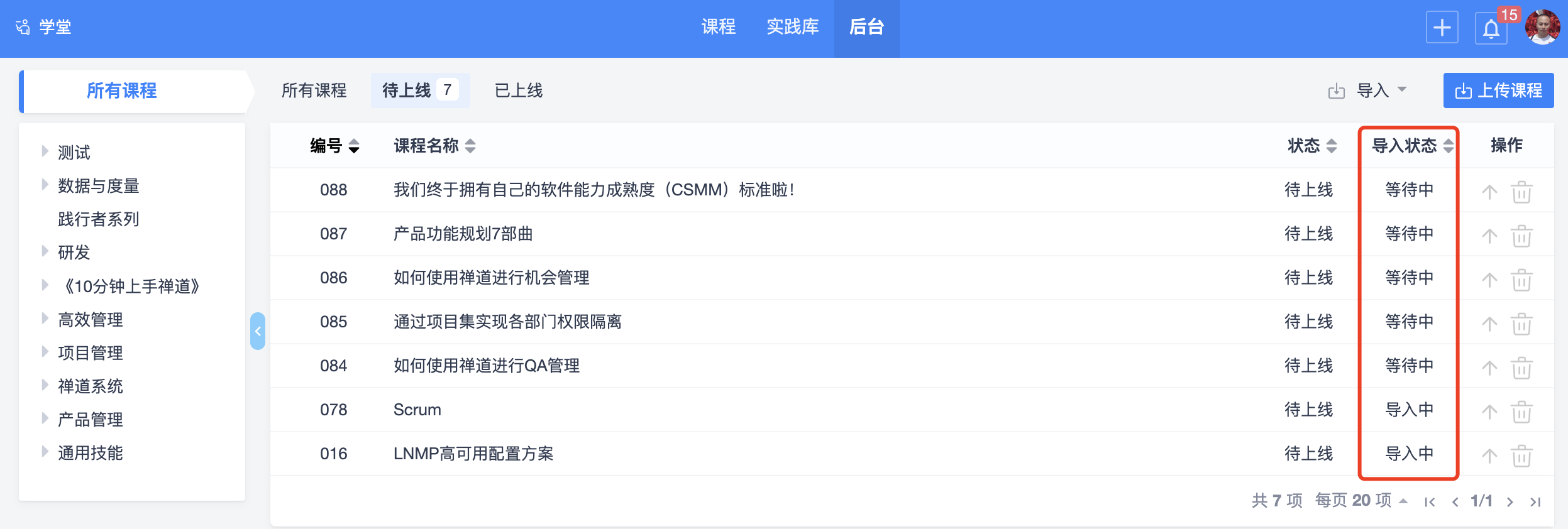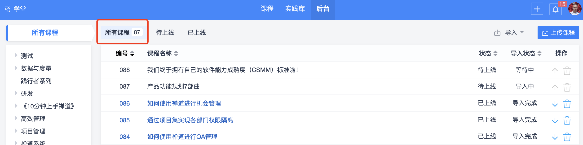 目前学堂的后台管理功能仅支持导入禅道平台提供的视频课程,后续如果企业有需求,我们会逐步开放给企业维护自己内部的课程体系。