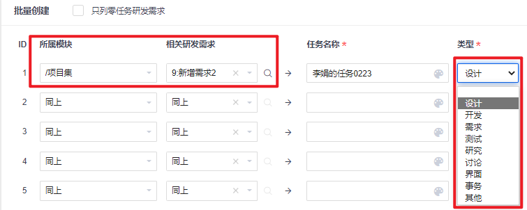 点击项目/执行需求列表右侧操作栏的分解任务和批量分解按钮,可以把需求分解为一个或者多个任务,多种类型的任务。