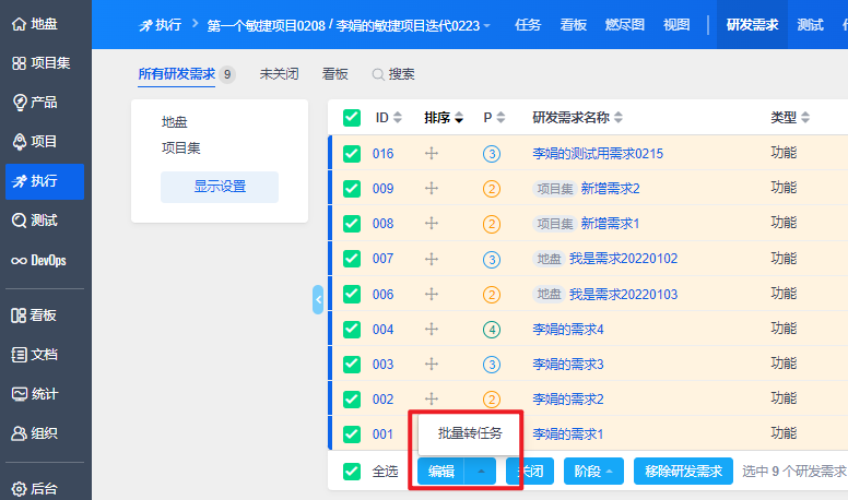在项目/执行--需求列表页,勾选需要分解任务的需求,点击编辑按钮,再点击弹窗中的批量转任务按钮,来进行分解任务。