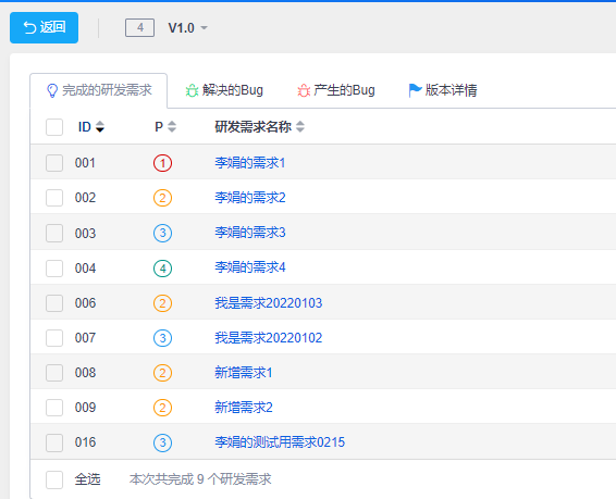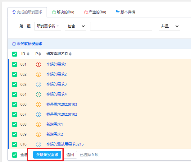 完成的需求:关联到构建里已研发完毕的需求