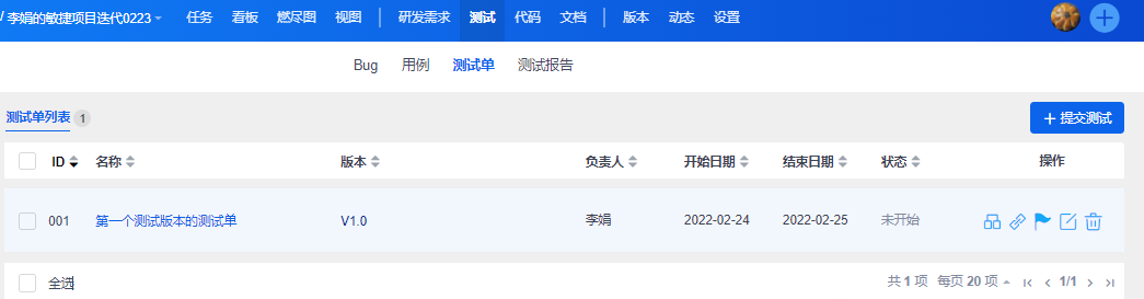 创建成功的测试单,可以在项目/执行--测试--测试单列表里查看到。