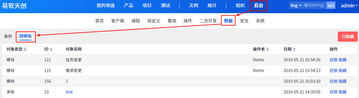 禅道10.6后,回收站位置由原来的后台——回收站改为后台——数据——回收站。