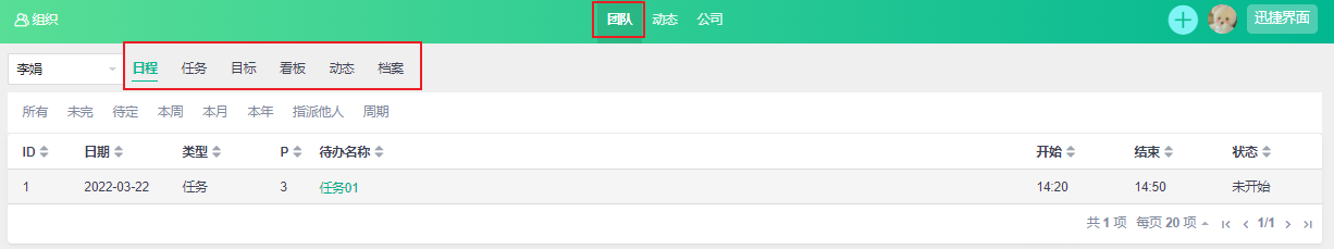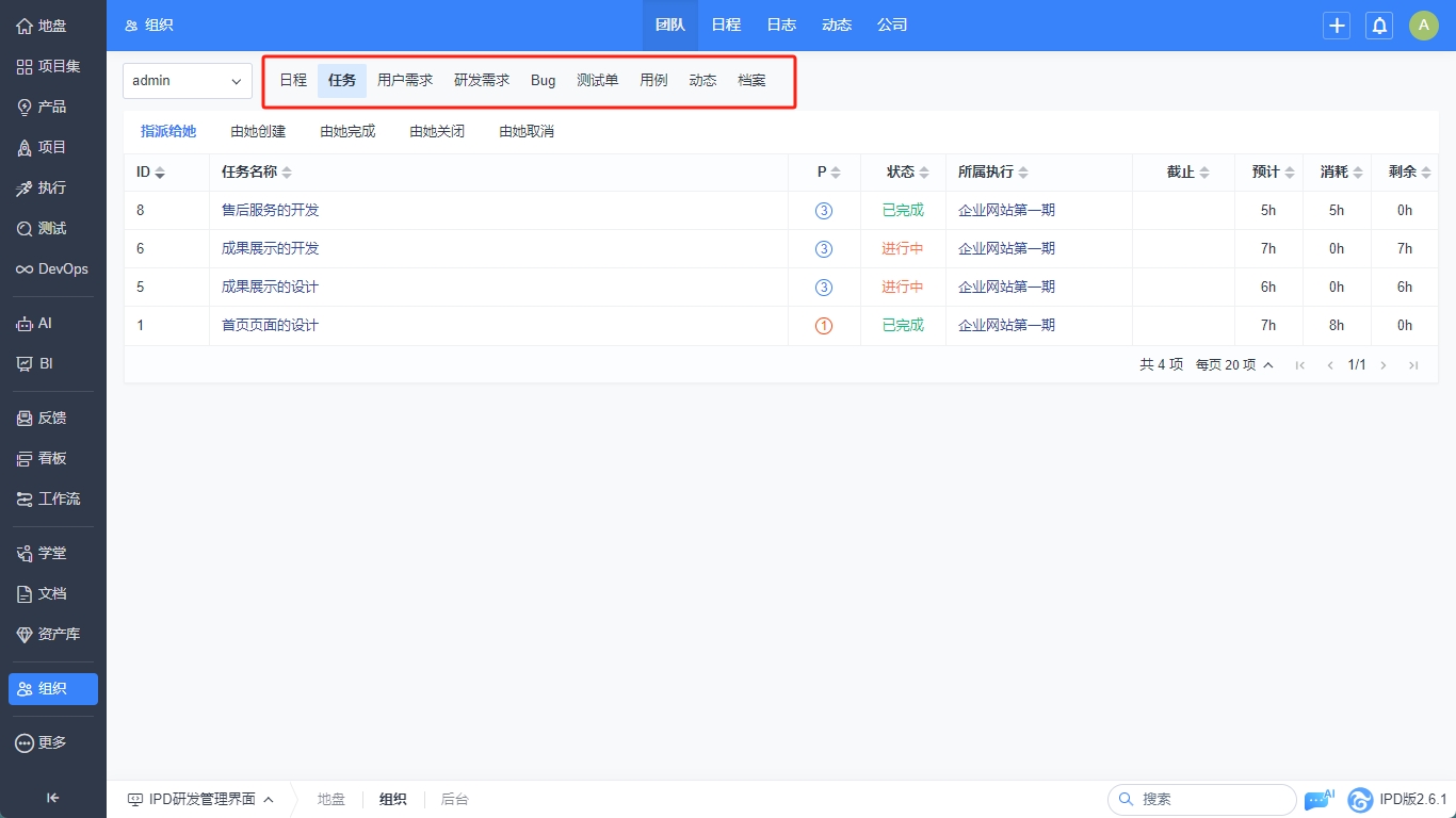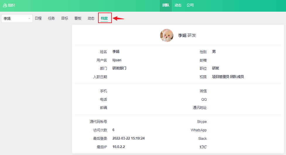 点击成员进入该成员的工作详情页面,可查看该成员的日程、任务、用户需求、研发需求、Bug、测试单、用例、动态、档案。