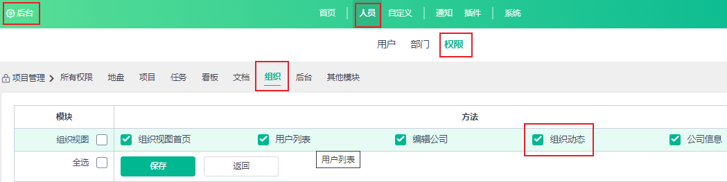 访问组织动态页面需要在后台-用户-权限中进行给用户该权限。