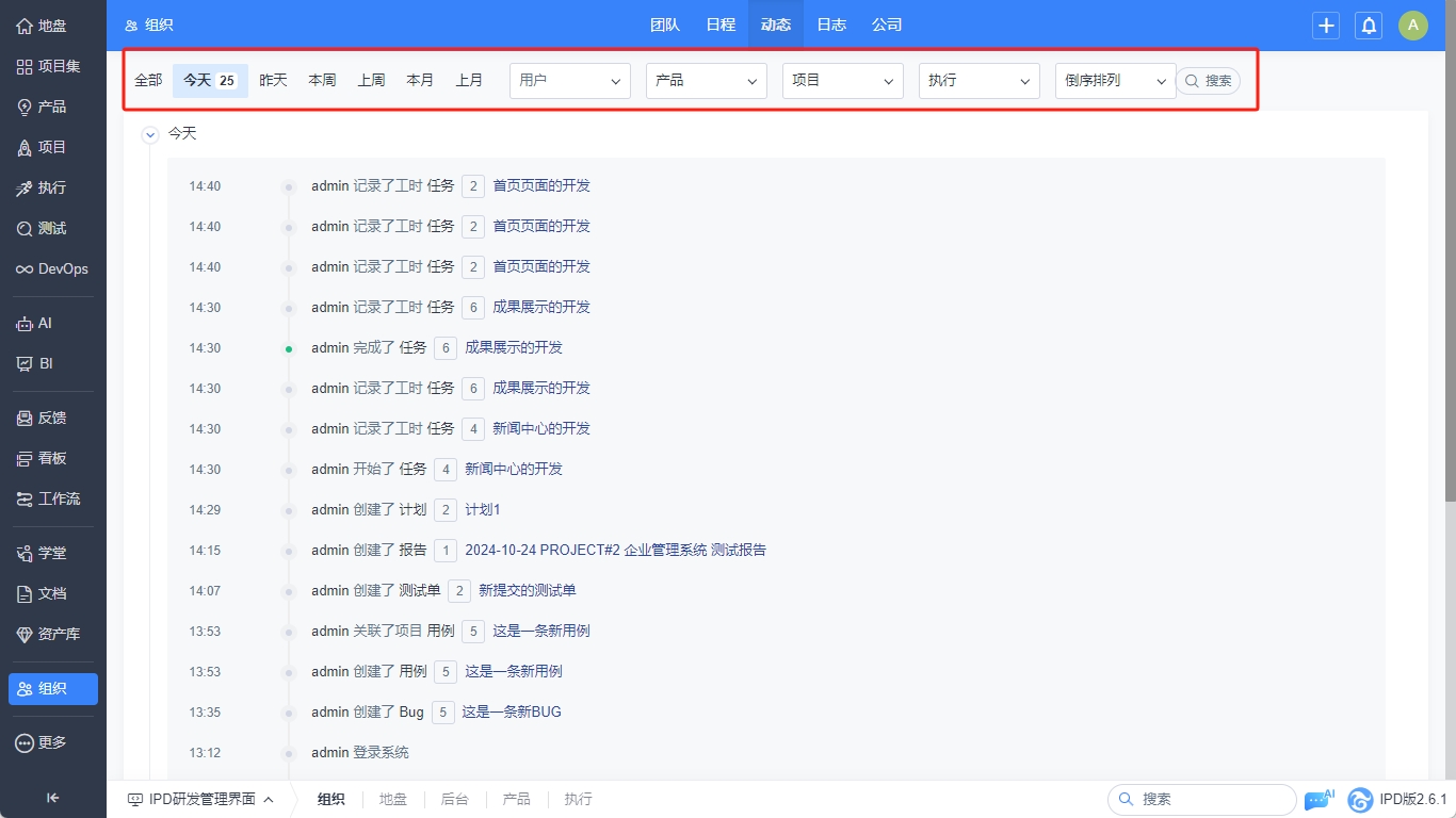 在组织-动态中查看禅道迅捷版系统的所有动态,可根据时间段和工作内容进行筛选查看。