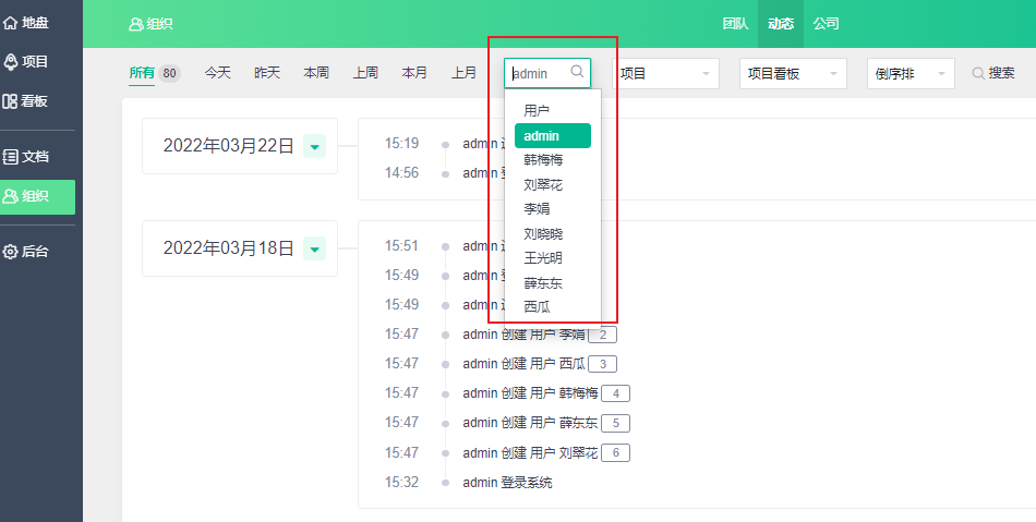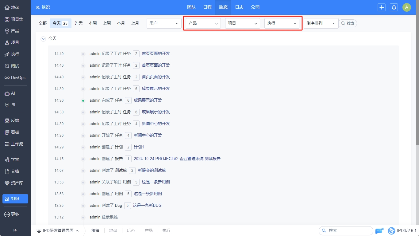 在组织-动态中查看禅道迅捷版系统的所有动态,可根据时间段和工作内容进行筛选查看。
