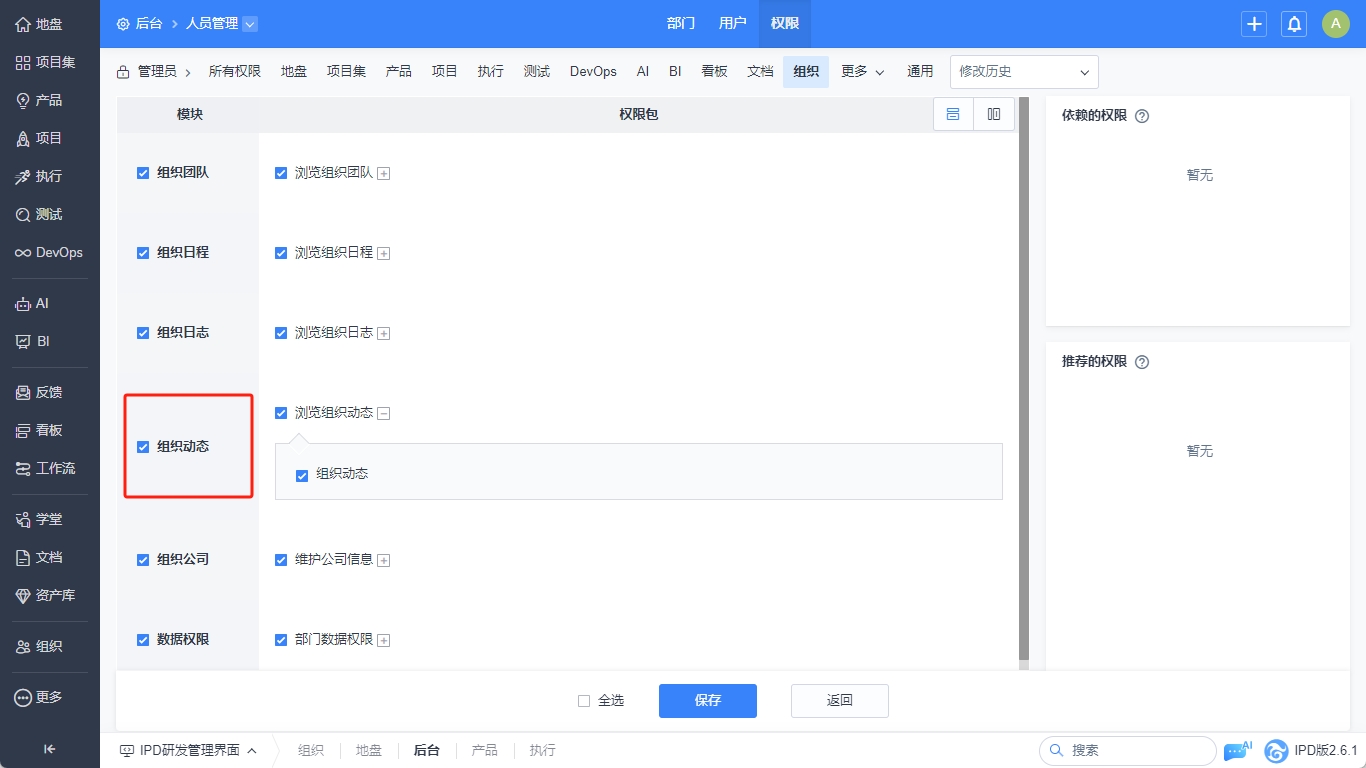 访问组织动态页面需要在后台-用户-权限中进行给用户该权限。