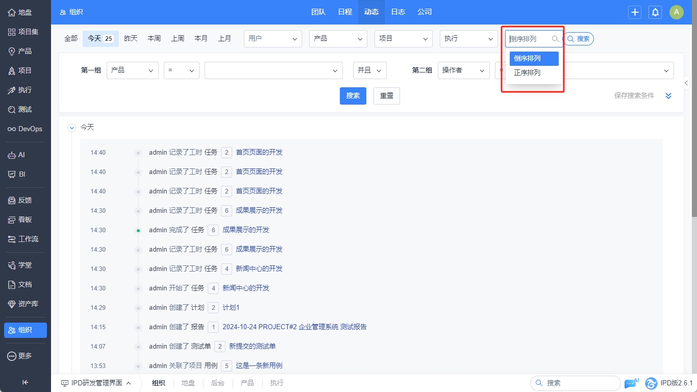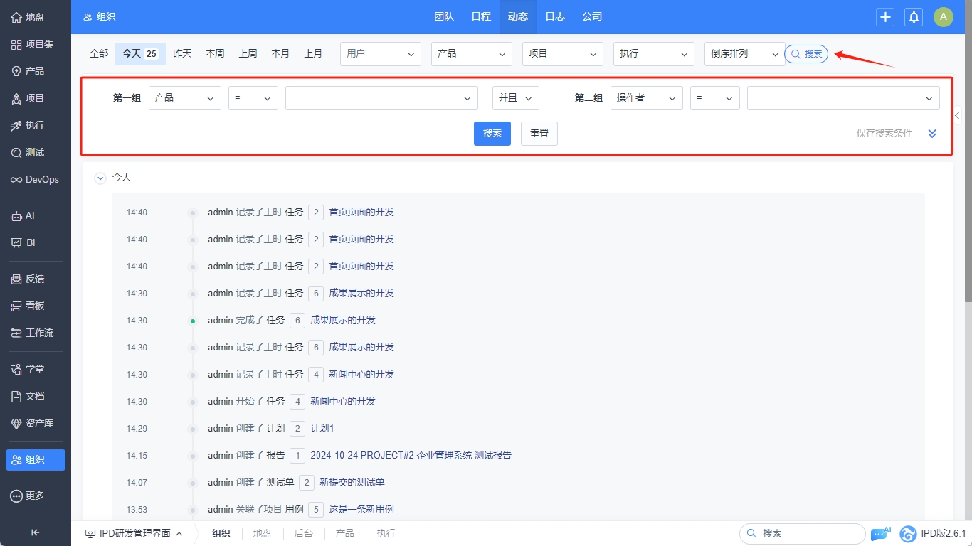 选择产品、项目、执行后查看相关动态或使用搜索表单快速查看相关动态。
