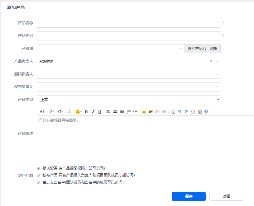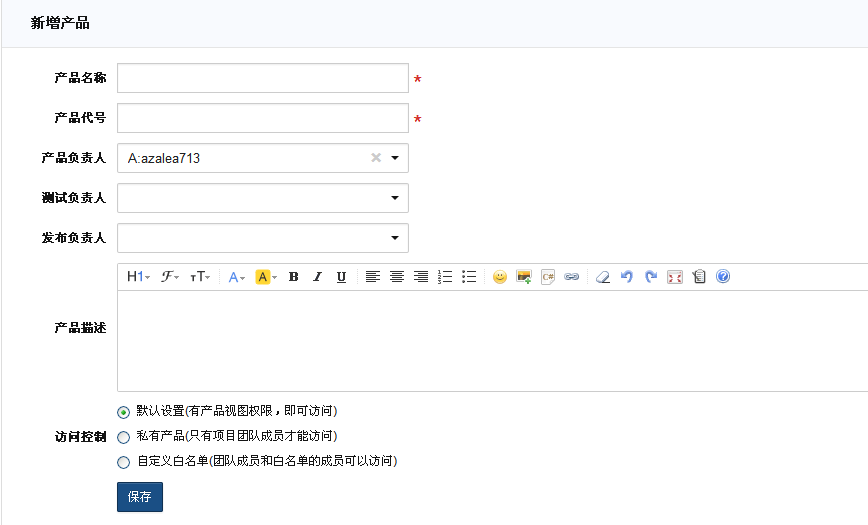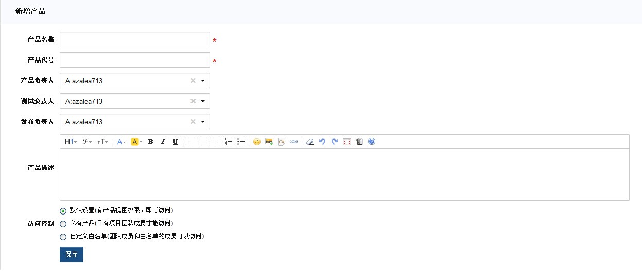 创建需求的前提当然是要有产品,这和bug的处理是一样的。新增产品的时候,需要设置产品的名称、代码,几个负责人信息。
