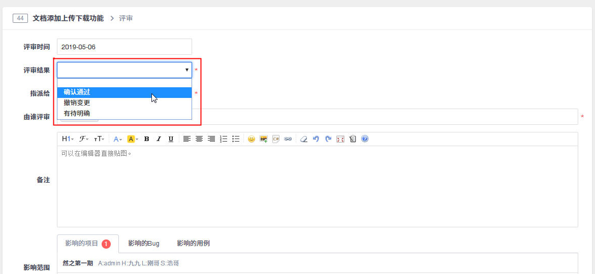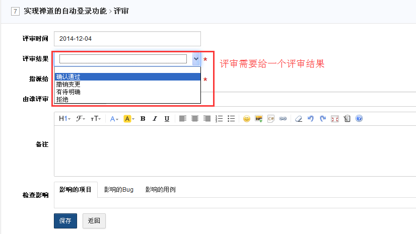 评审结果可以选择确认通过,撤销变更,有待明确或者拒绝。