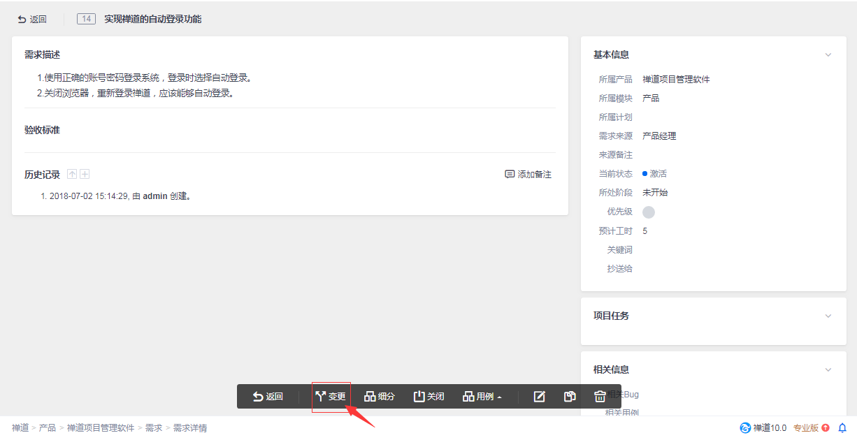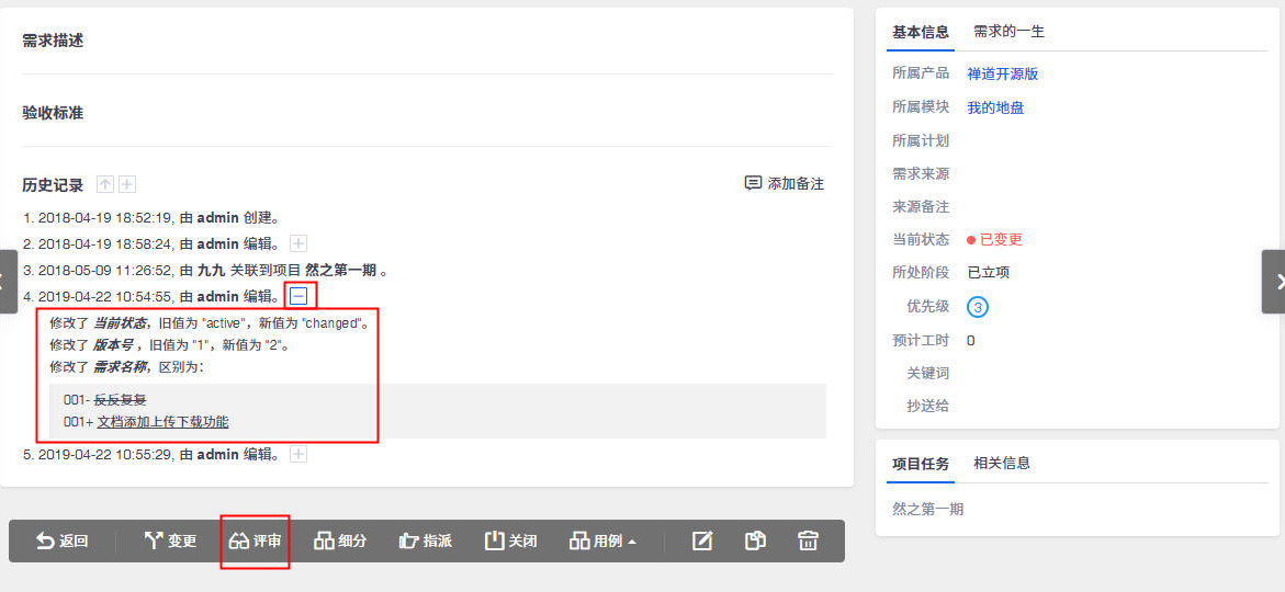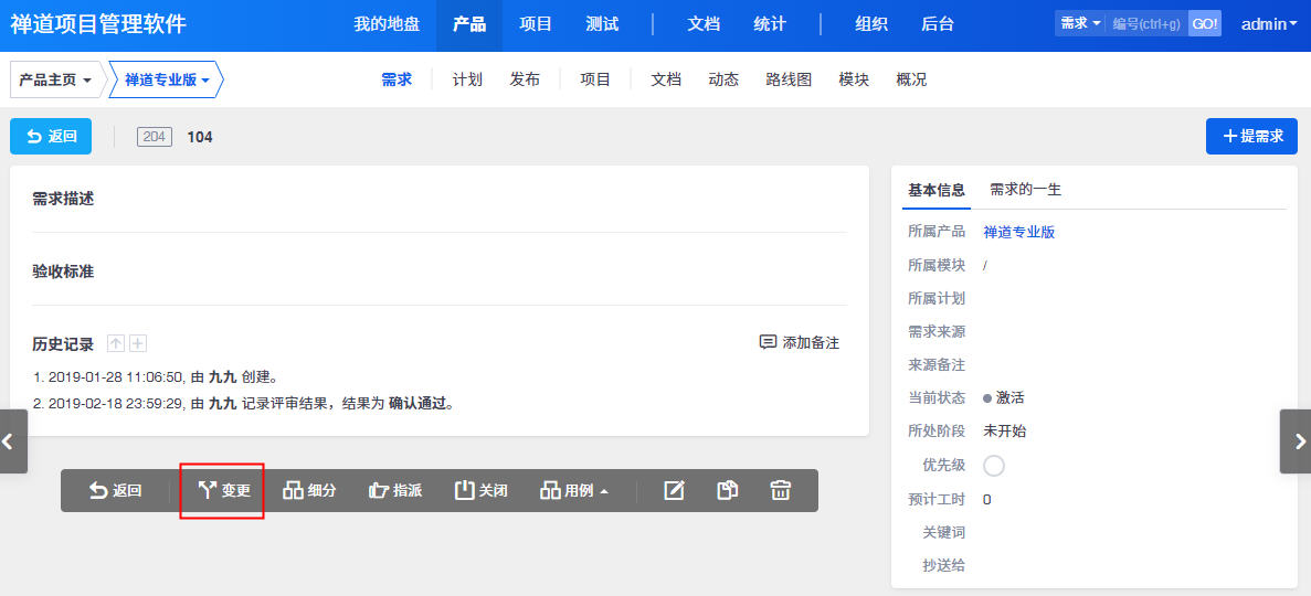 禅道专门提供了需求的变更流程。凡是对需求标题、描述、验证标准和附件的修改,都应该走变更流程。变更之后的需求状态为变更中。