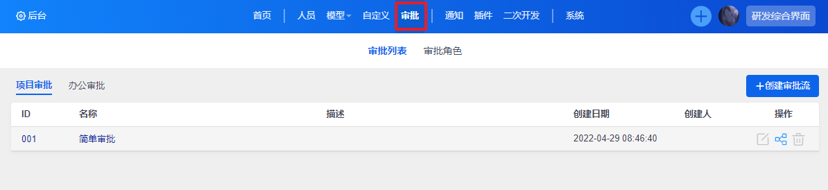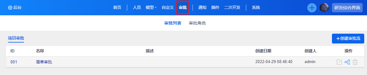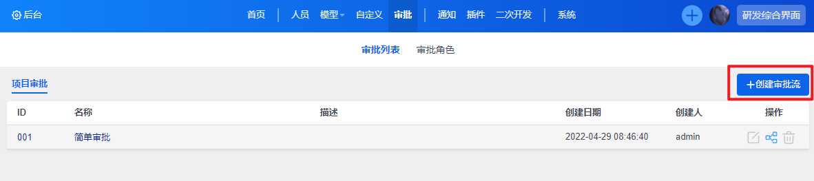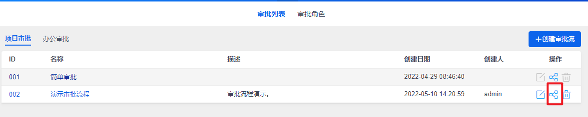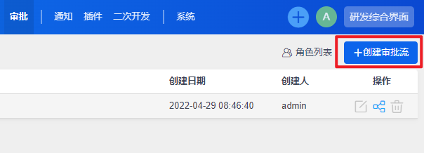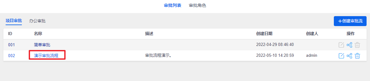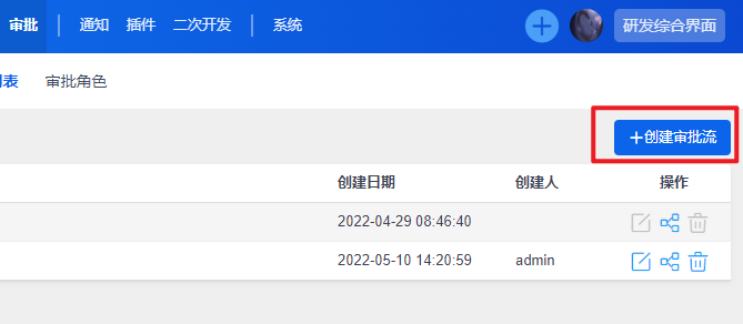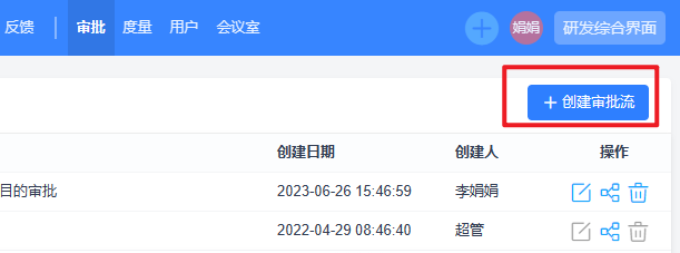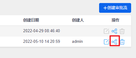 进入到审批页面后,可以点击创建审批流按钮来新增审批流程,或在列表右侧操作按钮中编辑已有的审批流: