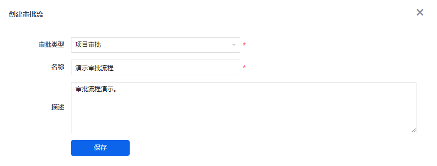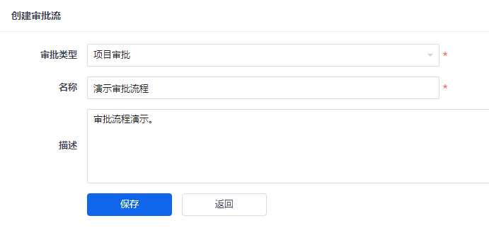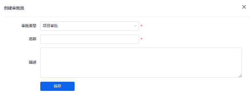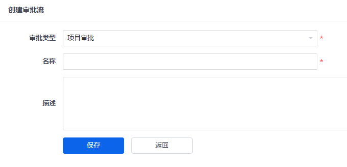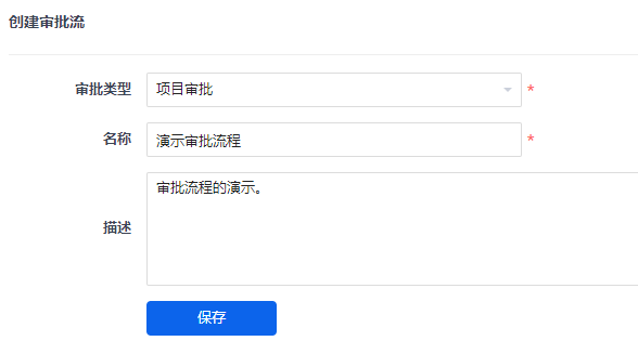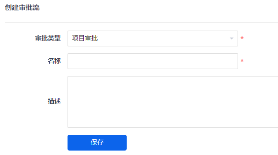 在创建审批流的页面需要填写审批流名称、类型、描述信息。