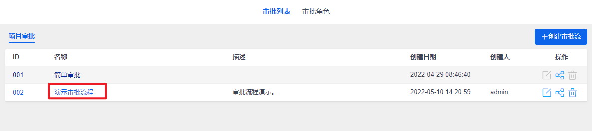 点击保存之后,页面跳转回列表页,可以查看到刚刚创建的审批流: