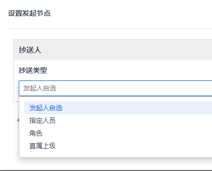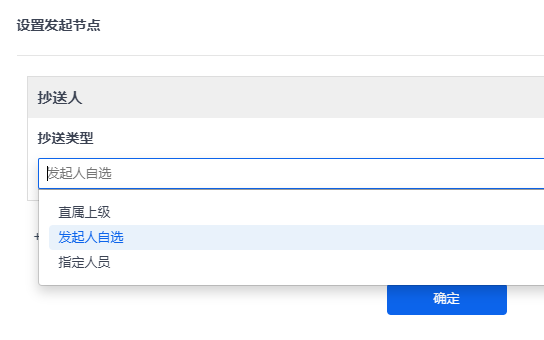 - 发起人自选:在发起审批页面,由发起人手动选择。(可以不限制范围,也可以通过角色、部门、职位进行限制。)