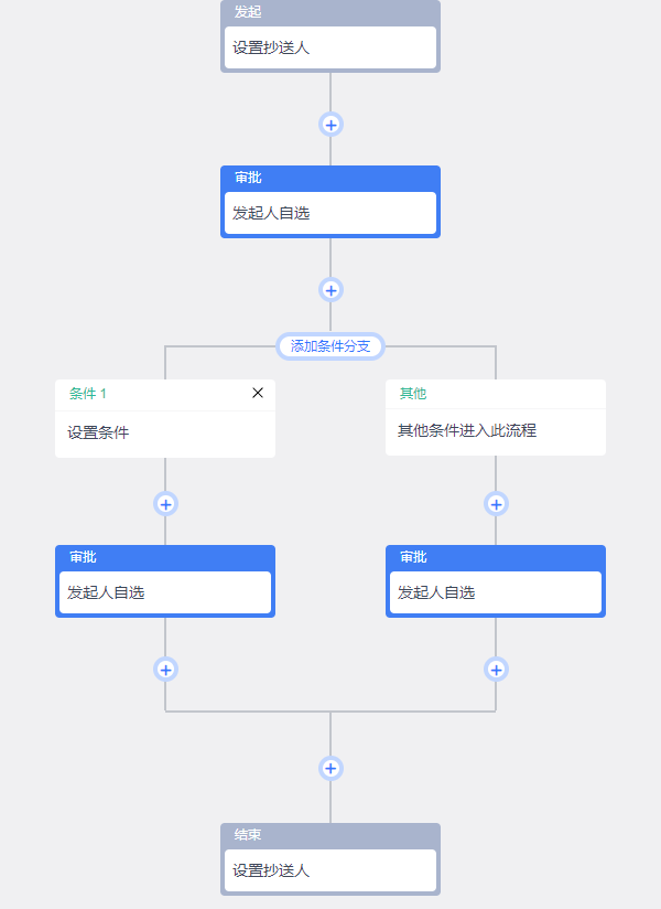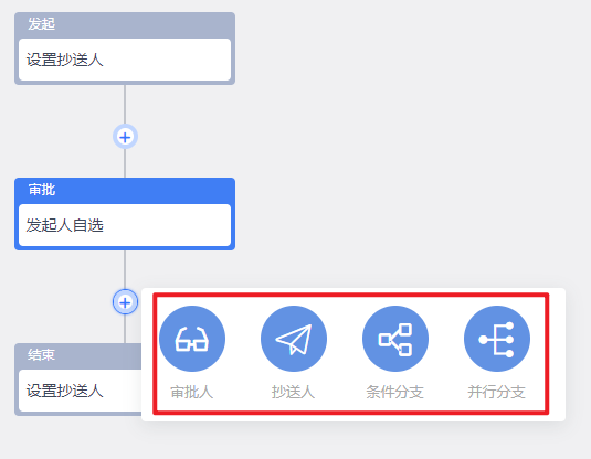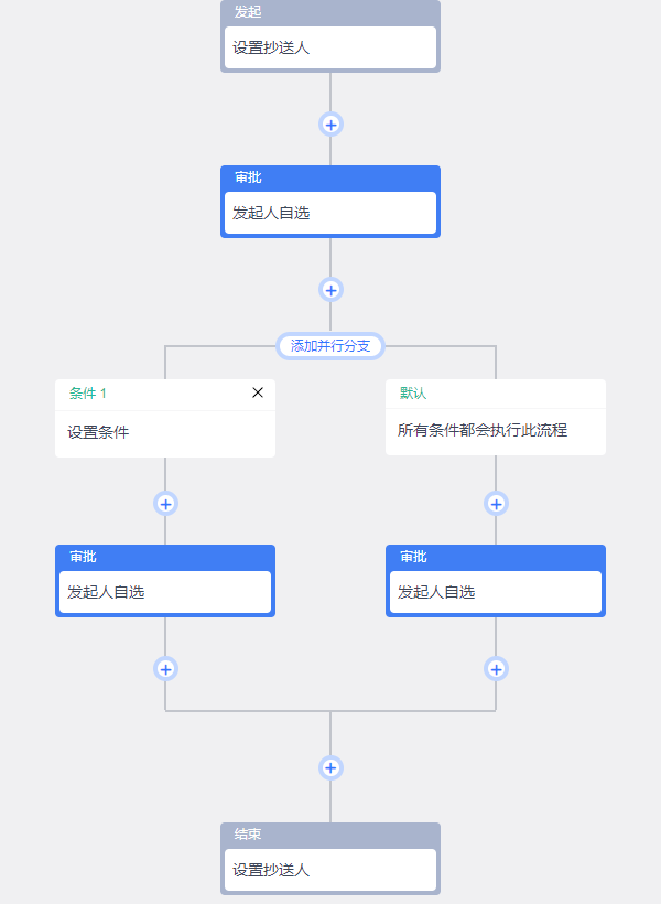 我们也可以点击节点间的加号图标为审批流新增节点、分支:
