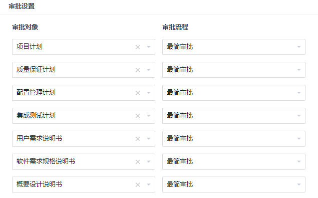 此处列出的审批对象是瀑布项目-评审下的所有评审对象(可后台自定义),这里的评审对象即使不设置审批流程,也会走默认的最简审批流程(系统内置,不可删除)