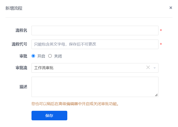 新增工作流时可以直接开启审批功能。
