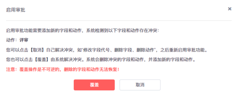 开启审批设置时需要检查字段和动作是否重复。如果重复根据提示信息操作: