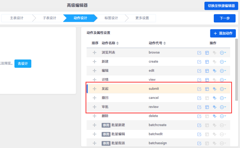 启用审批后添加默认的字段、动作和标签: