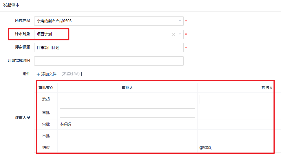 维护好审批对象和审批流程的关联关系后,我们可以到瀑布项目-评审模块下发起一个审批流程: