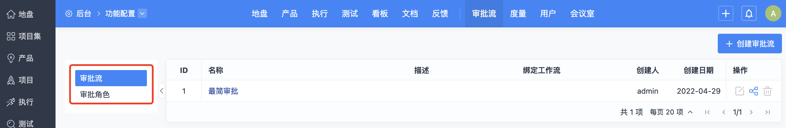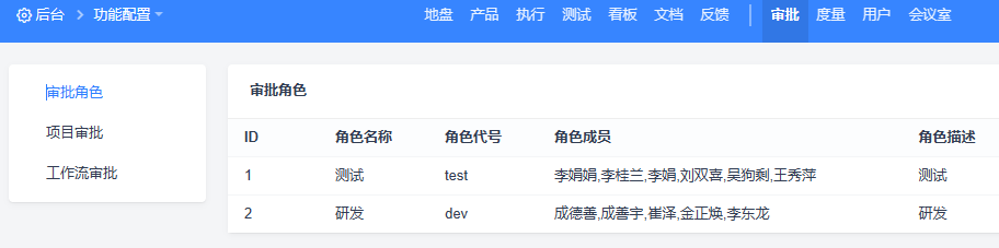 点击左侧后台导航,进入功能配置的审批页面(需系统管理员分配审批权限),可以设置审批角色、项目审批流、工作流审批流。