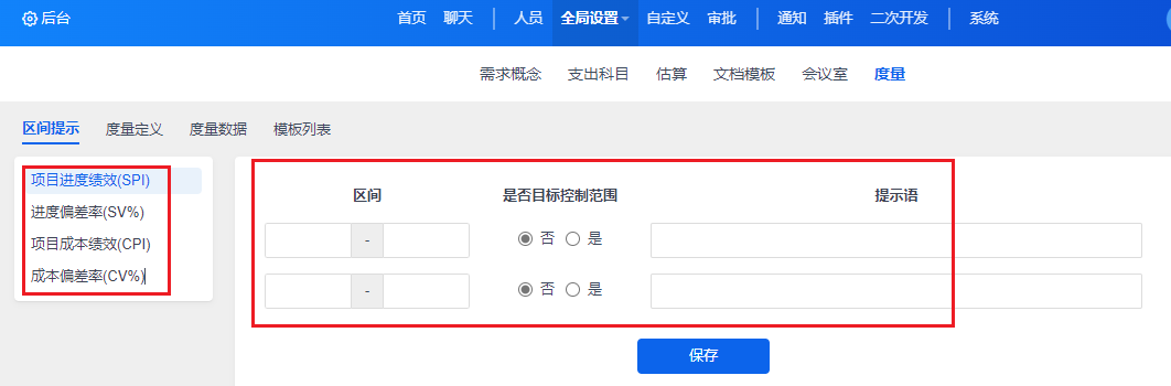 5.后台--功能配置--度量--区间提示,可以设置项目进度绩效、进度偏差率、项目成本绩效、成本偏差率的区间、是否目标控制范围、提示语等信息。