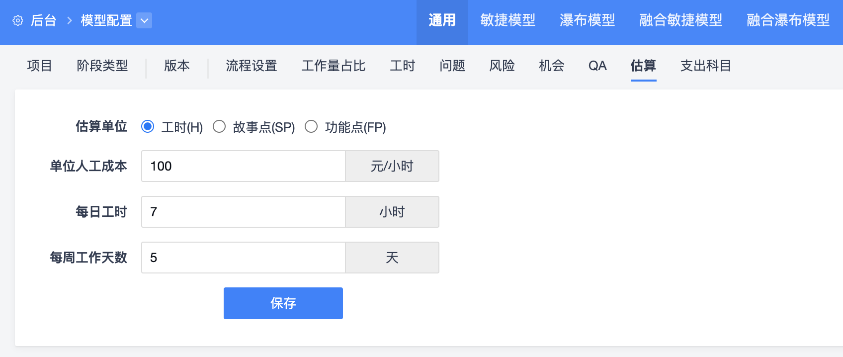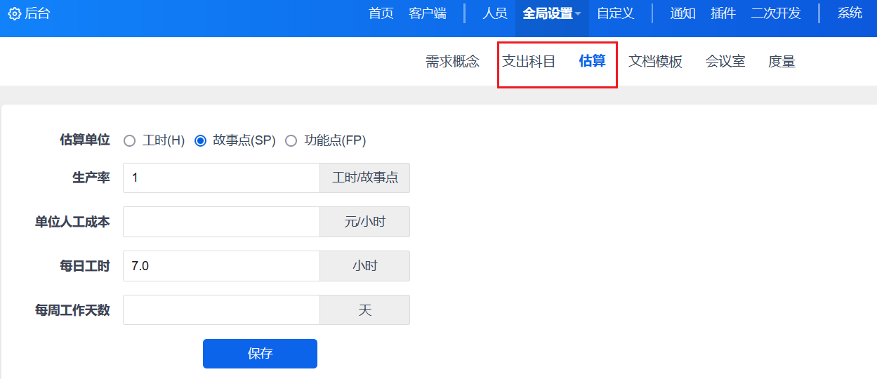 1.后台--模型配置--通用--估算中可以配置:估算单位、单位人工成本、每日工时、每周工作天数。