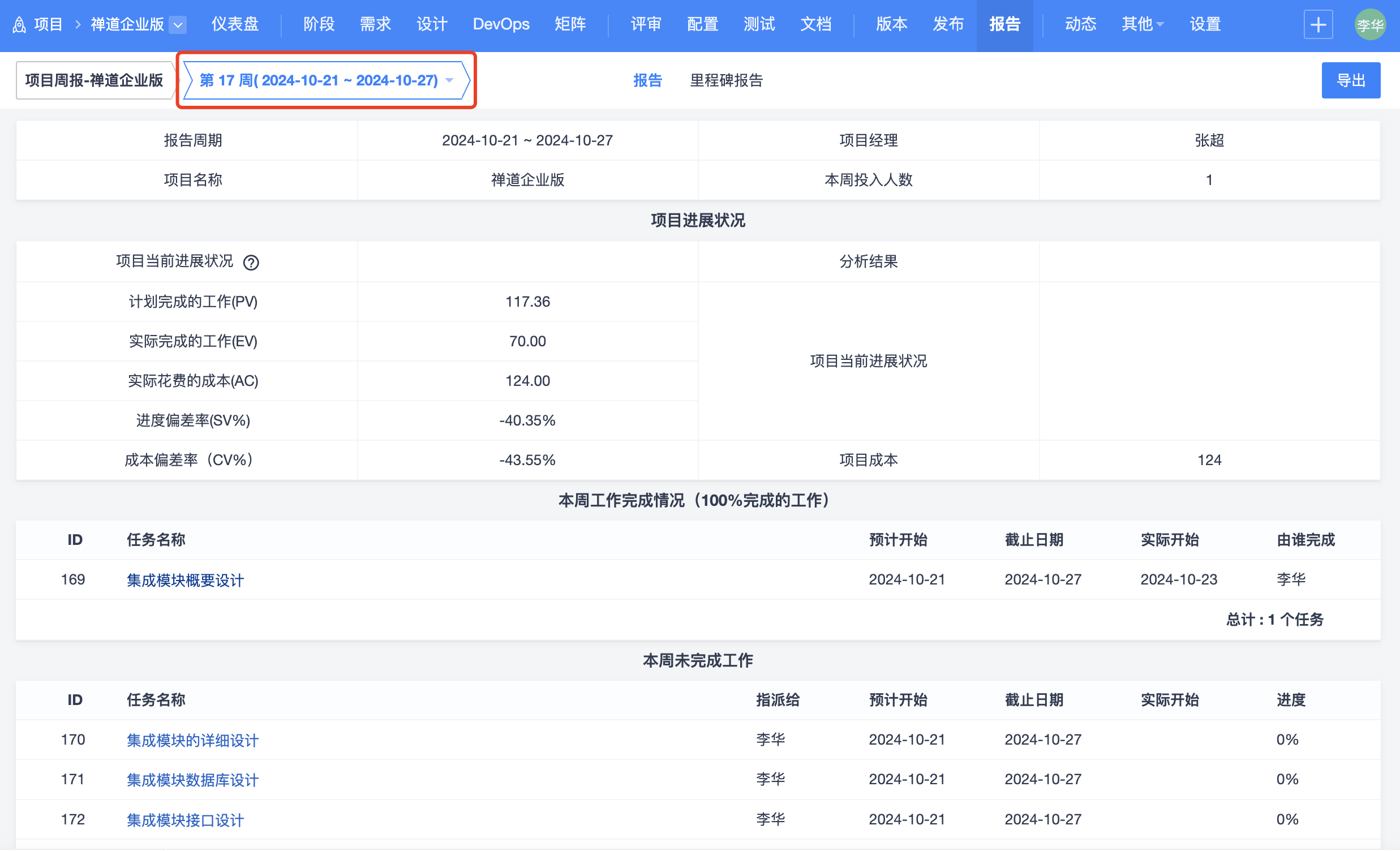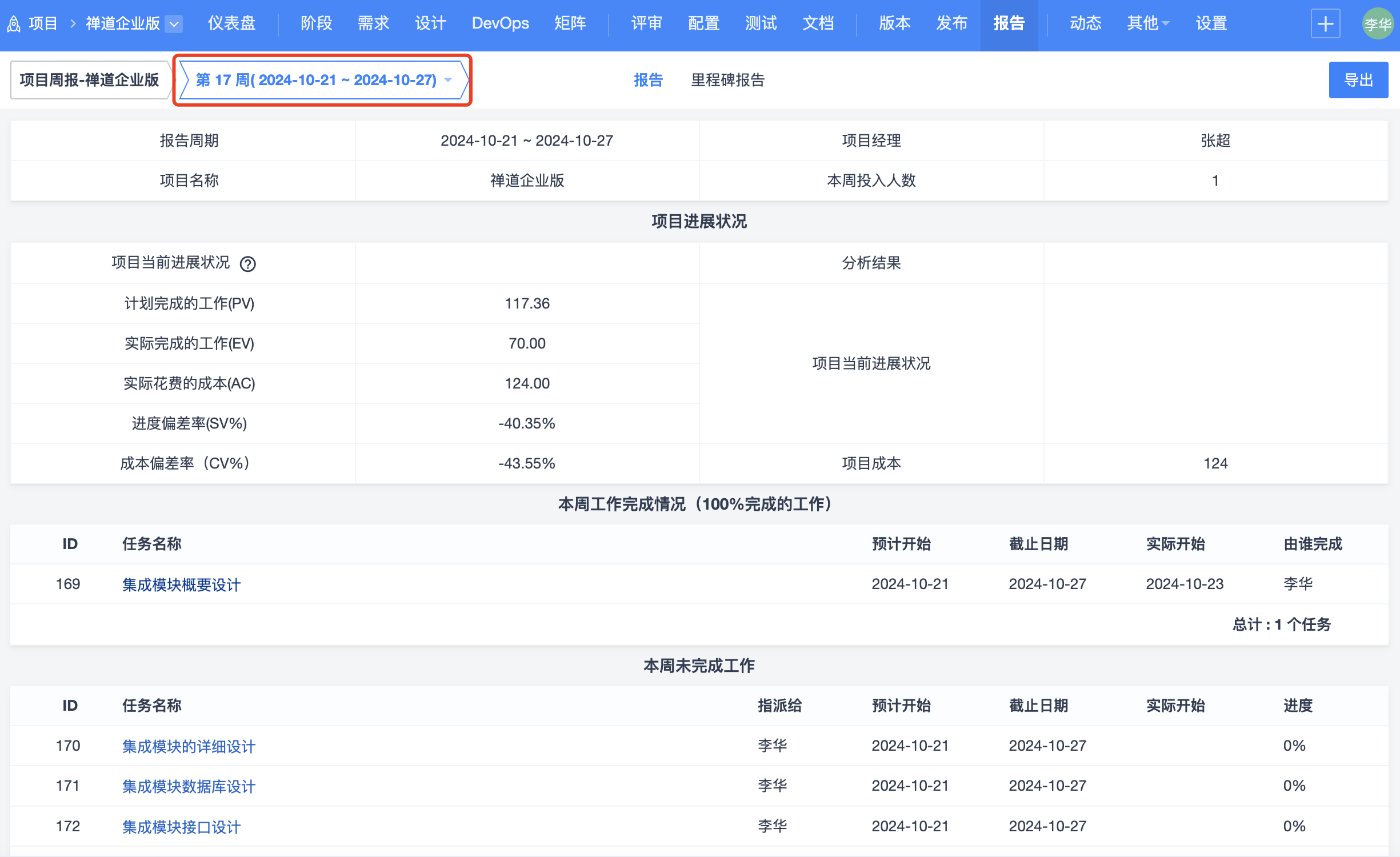 项目--报告下,也可以按周查看项目进度。